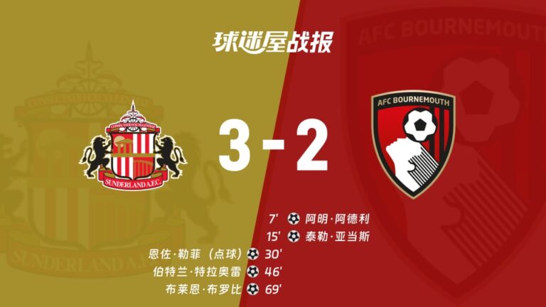 腾讯NBA直播链接【英超联赛】桑德兰对阵伯恩茅斯比赛结果:桑德兰 3-2 伯恩茅斯 比分报告(2025年11月29日)