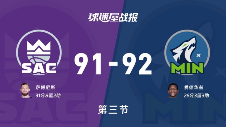 NBA总决赛投注指南国王队对阵森林狼队:第三节结束,国王队 91-92 森林狼队,萨博尼斯得到 31 分。